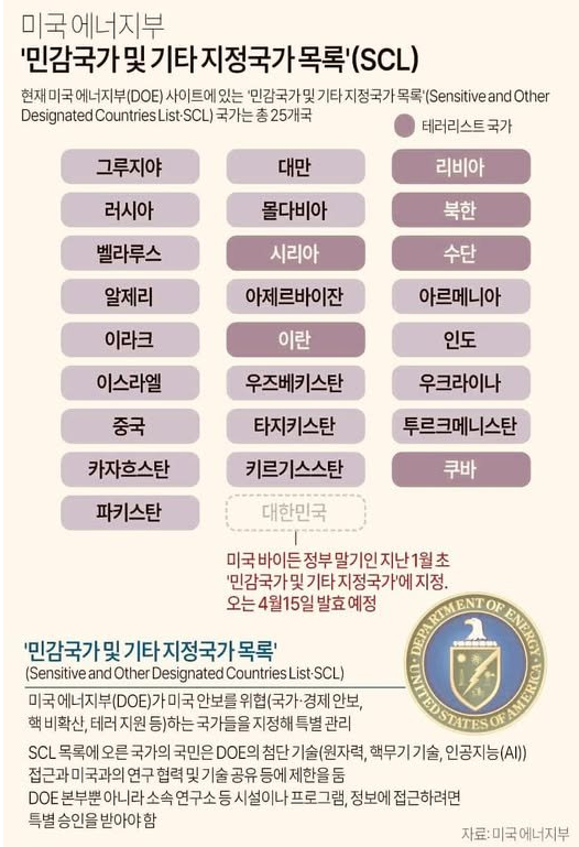 최근 미국 에너지부(DOE)가 발표한 '민감국가 및 기타 지정국가 목록(Sensitive and Other Designated Countries List, SCL)'에 한국이 포함되었다는 뉴스가 화제가 되고 있습니다. SCL에 포함된 국가는 미국과의 첨단기술 협력, 연구개발, 무기 및 핵 관련 기술 공유 등에 제한을 받을 수 있기 때문에 한국 경제와 외교 관계에 미칠 영향에 대한 관심이 커지고 있습니다.