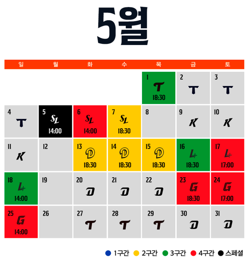 | 5월 2일 | KIA 타이거즈 | 광주 | 금 | 18:30 |