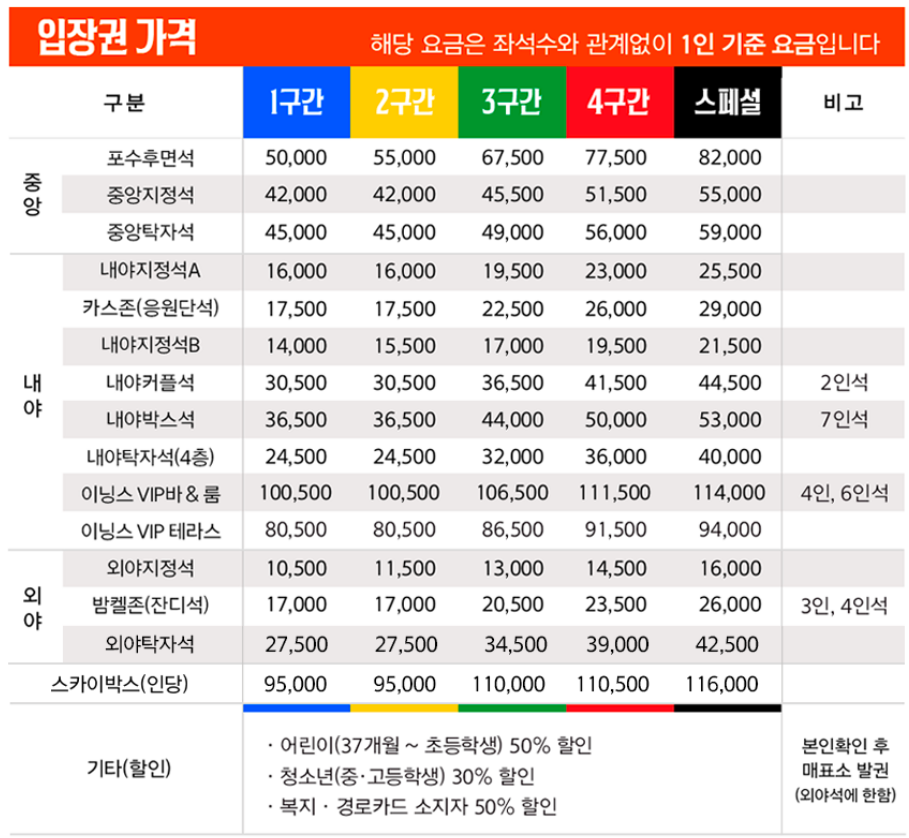 | 내야 탁자석 | 24,500 ~ 40,000원 | 가족, 커플에게 인기 |