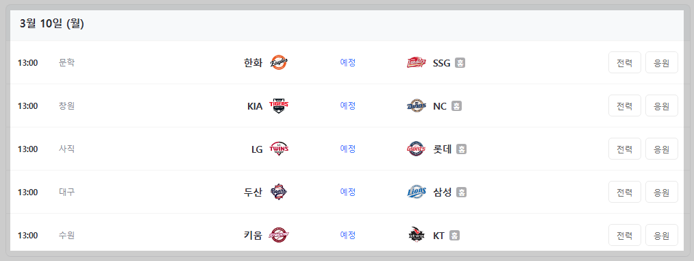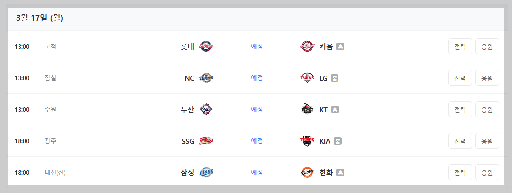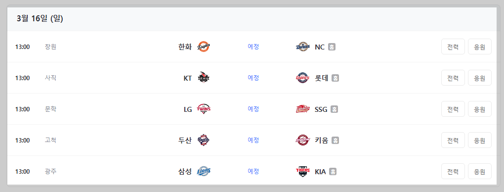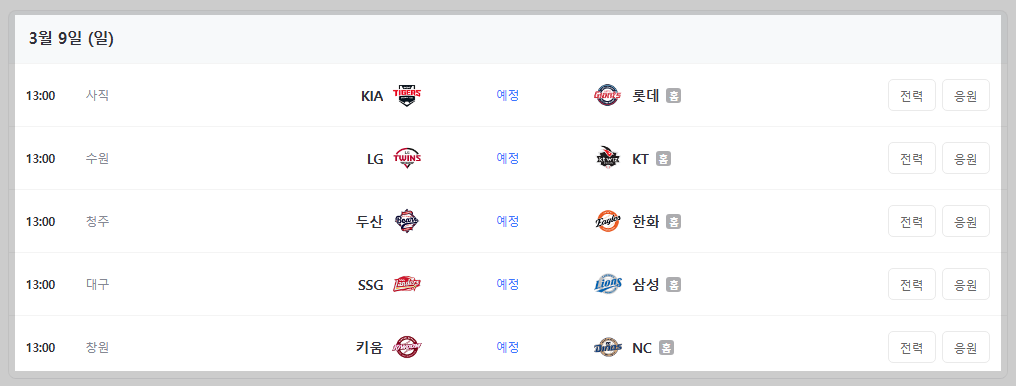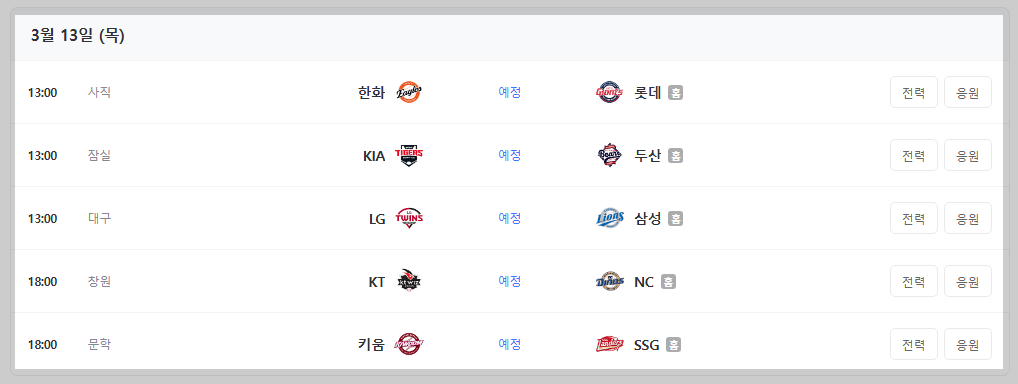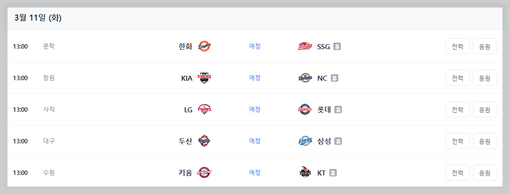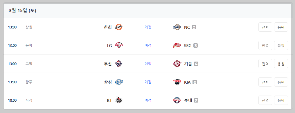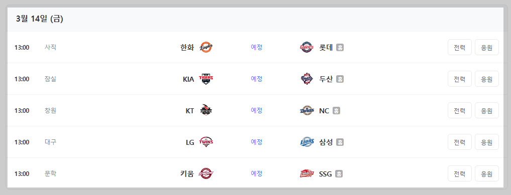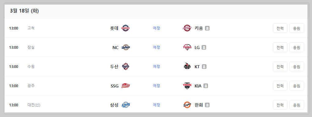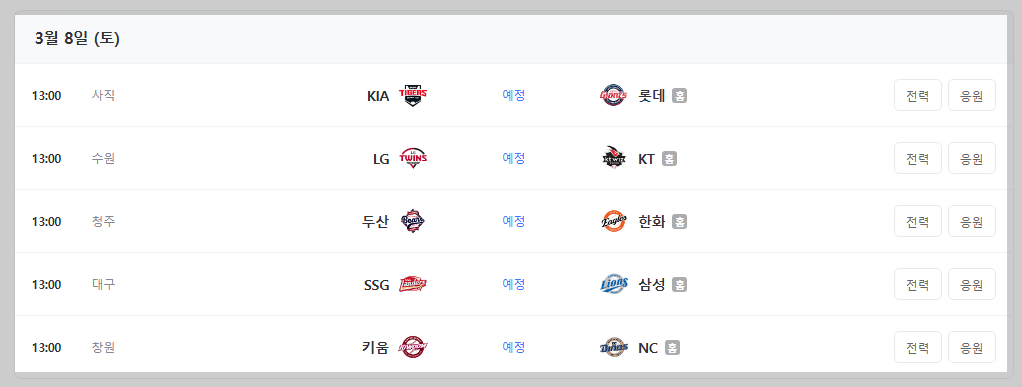 올해 시범경기의 첫 경기는 아래와 같이 진행됩니다.