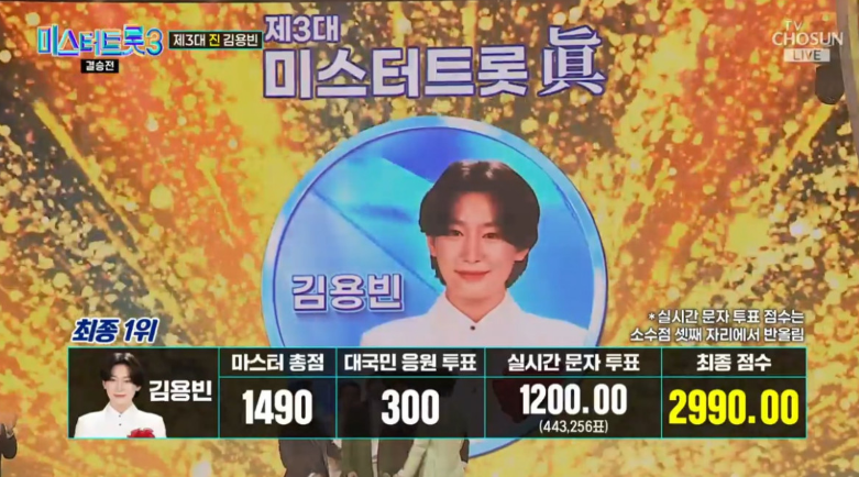 2025년, 김용빈 씨는 '미스터트롯3'에 참가하여 뛰어난 가창력과 무대 매너로 시청자들의 마음을 사로잡았습니다. 특히 대국민 응원투표에서 5주 연속 1위를 차지하며 '부동의 1위'라는 수식어를 얻었습니다. 결국 최종 우승을 거머쥐며 제2의 전성기를 맞이하게 되었습니다.